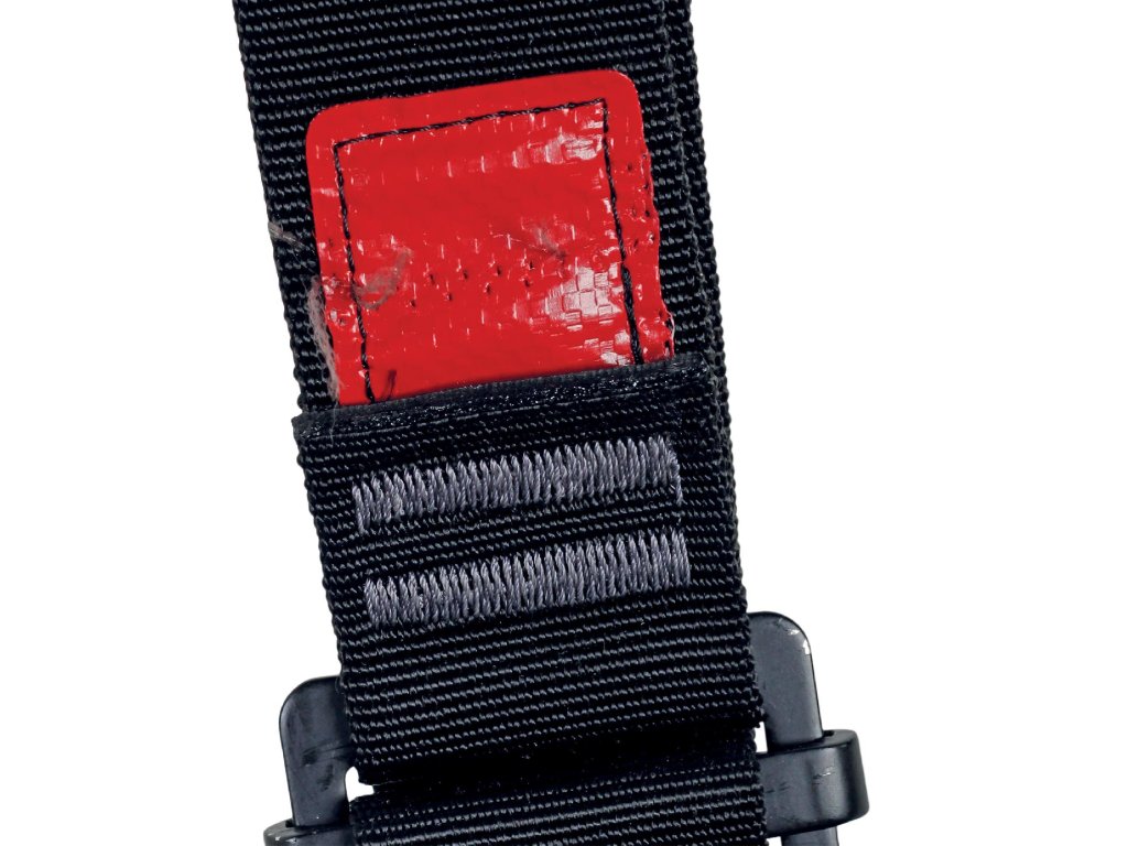 - pro snazší revizi je postroj vybaven indikátorem pádu v oblasti zádového připojovacího bodu, který se následkem pádu aktivuje, červená etiketa signalizuje nutnost vyřazení postroje